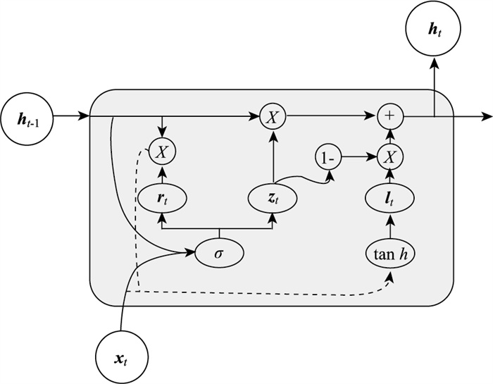 | $ \left\{\begin{array}{l} \boldsymbol{r}_t=\sigma\left(\boldsymbol{W}_r \boldsymbol{x}_t+\boldsymbol{U}_r \boldsymbol{h}_{t-1}\right) \\ \boldsymbol{z}_t=\sigma\left(\boldsymbol{W}_z \boldsymbol{x}_t+\boldsymbol{U}_z \boldsymbol{h}_{t-1}\right) \\ \boldsymbol{l}_t=\tanh \left(\boldsymbol{W} \boldsymbol{x}_t+\boldsymbol{U} \boldsymbol{r}_t \odot \boldsymbol{h}_{t-1}\right) \\ \boldsymbol{h}_t=\boldsymbol{z}_t \boldsymbol{h}_{t-1}+\left(1-\boldsymbol{z}_t\right) \boldsymbol{l}_t \end{array}, \right. $ | (14) |