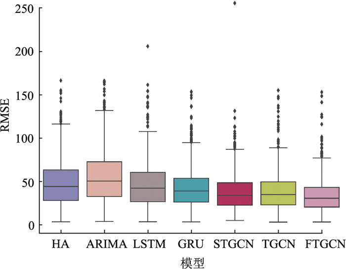高速公路交通流量预测更常用的场景是在大流量情况下,大流量时更容易出现交通拥堵。为了进一步评价FSTGCN模型在整个路网上的性能,尤其是在离群点的预测性能,本研究计算了FSTGCN模型与基准模型每个节点的RMSE,并用箱型图的方式可视化展示。如图 7所示,箱子中间的线是数据的中位数,代表了误差的平均大小,箱子内包含50%的数据,即箱子的宽度反映了误差的波动程度,上下两条线代表数据在统计学上的理论最大最小值,超出上限的黑点为数据中离群的点。这些离群点的数量越少,数值越小说明模型对极端值的预测性能越好,鲁棒性越高。表 4统计的是这些离群点的最大值和平均值。相比于LSTM模型,FSTGCN模型的最大RMSE减少了25.64%,平均RMSE减少了27.05%。相比于GRU模型,FSTGCN模型的最大RMSE减少了0.35%,平均RMSE减少了10.54%。相比于STGCN模型,FSTGCN模型的最大RMSE减少了40.13%,平均RMSE减少了6.99%。相比于TGCN模型,FSTGCN模型的最大RMSE减少了1.32%,平均RMSE减少了13.69%。因此,本研究提出的FSTGCN模型还具有较高的鲁棒性。