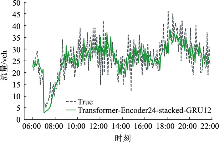 选取24个时间窗口的1,2车道时序多元参数输入矩阵经Transformer-Encoder车道融合框架得到特征融合矩阵,并拼接目标车道流量序列矩阵生成GRU模型的输入参数,选取12个时间窗口数据作为输入预测未来1 h的交通流量。图 10为本节模型(Transformer-Encoder24-stacked-GRU12)在7月23日剔除夜晚22 : 00—清晨5 : 00数据后的真实值与预测值的对比效果图,从图中可以看出,所提模型的预测曲线与真实曲线在早、午和晚高峰的变化趋势基本符合,具有较好的拟合效果,表明本节所提方法是一种有效的交通流预测方法。
