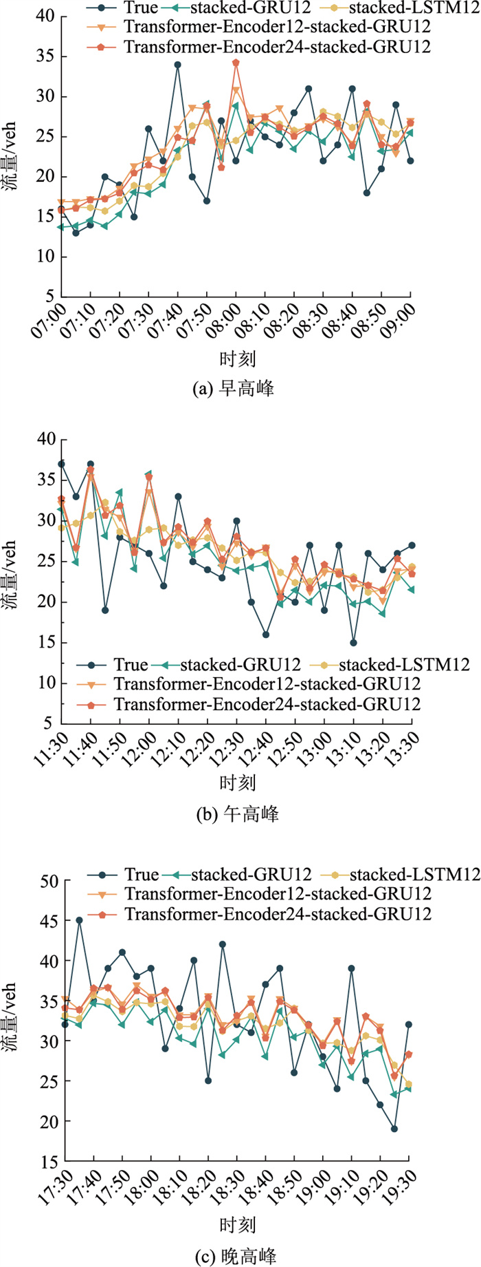 为显化各模型预测效果,将7月23日各模型预测的早、午、晚高峰结果可视化为图 8所示,横、纵坐标分别表示时间和交通流量。其中,True为真实流量数据,Transformer-Encoder12-stacked-GRU6为本研究所提模型,stacked-GRU6、stacked-LSTM6分别为单时间窗口模型预测曲线,Transformer-Encoder6-stacked-GRU6表示仅考虑横向空间关系的预测模型。由图 8可知,stacked-GRU6与stacked-LSTM6曲线较为相似,在流量相对平稳的时间段内表现出较好的预测效果,但在极值点附近起伏波动较大,而Transformer-Encoder6-stacked-GRU6和Transformer-Encoder12-stacked-GRU6模型由于考虑了车道级横向空间关系,其拟合曲线更贴近真实值,相较于基准线模型其预测结果均有显著提升。