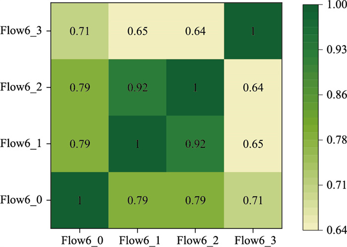 1 交通流时空特性分析 1.1 交通流车道级时间特性断面交通流的时间特性表现为车辆运行过程中,其流量变化随时间演化呈现出一定规律性[22]。为反映同一车道相邻工作日交通流数据间的时间依赖关系,本研究使用合肥市天智-黄山路交叉口6号检测器的1号车道流量数据为研究对象,分析工作日2016.7.11—2016.7.15期间的时间关联特性,其结果以热力图的方式展现,具体如图 1所示。分析图 1可知,每个工作日间的车道流量关联程度均高于0.8,呈高度相关,可见车道未来交通流量的变化规律强依赖于历史交通流,即交通流的时间特性,进一步验证了在流量预测模型中考虑交通流时间特性的必要性。