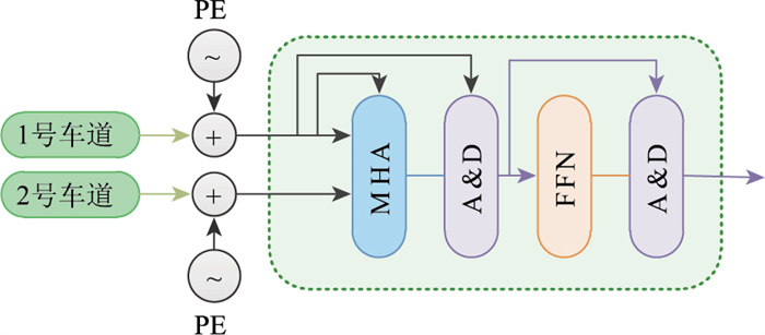利用正余弦函数根据车道特征位置和维度变化生成位置编码,以学习时间相关性;通过多头注意力机制捕获横向相关车道数据,并进行时空特性融合;在此基础上,使用残差连接和层标准化进一步挖掘深层次时空特征,以此建立车道级融合框架,具体结构如图 4所示。图 5为横向车道级特征融合过程。