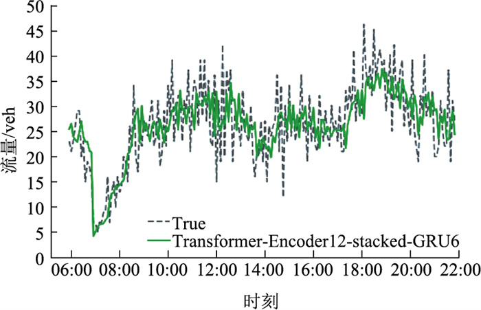 | 图 7 Transformer-Encoder12-stacked-GRU6流量预测 Fig. 7 Flow prediction with Transformer-Encoder12-stacked-GRU6 |