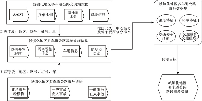 综上,机器学习方法在事故预测方面已体现出优势,尤其是随机森林等基于“树”的机器学习模型在以往的研究中表现出优异的预测能力,且可采用网格搜索、粒子群算法等方式进行模型优化,以及使用SHAP对模型进行可视化与可解释性分析。基于此,本研究针对城镇化地区多车道公路采集并构建事故数量预测数据集,运用随机森林、LightGBM和XGBoost构建城镇化地区多车道公路路段事故数量预测模型,采取PSO算法对模型进行优化,并利用SHAP方法分析影响此类路段行车安全性的关键因素。最后,根据模型分析结果提出相应的路段安全提升策略与建议,为相关部门在城镇化地区公路安全管理与决策中提供数据支撑。