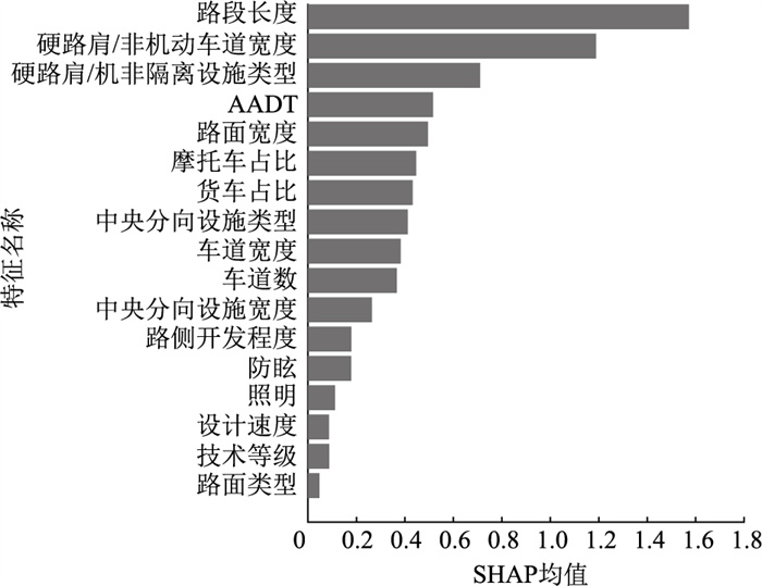 3.1 特征贡献度分析首先,绘制SHAP特征重要性排序图如图 2所示,图中以每个特征的平均绝对SHAP值为依据,衡量其对模型预测结果的重要性。结果显示,影响路段安全性的前5个关键特征依次为路段长度、硬路肩/非机动车道宽度、硬路肩/机非隔离设施类型、AADT和路面宽度。在城镇化地区多车道公路路面宽度受限的情况下,应优先保障非机动车道的设置需求,尤其是对于非机动车道宽度的设置。