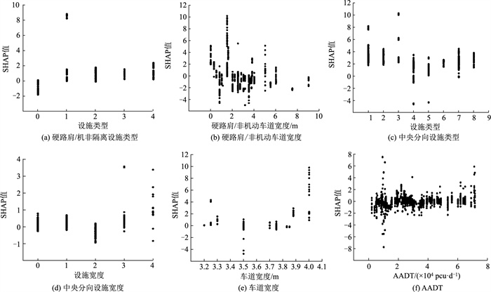 如图 3(c)所示,中央分向设施类型对路段安全性的影响差异较小,SHAP值接近。对于实体中分带的宽度(见图 3(d)),当实体中分带宽度为1~5 m时,SHAP值较低,这表明此宽度范围有利于提升路段安全性。