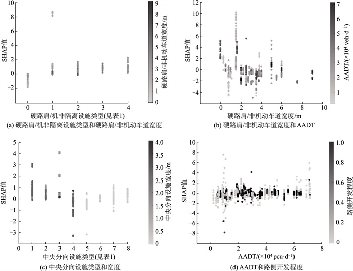 如图 4(b)所示,在交通量较小且硬路肩/非机动车道宽度较窄的路段,SHAP值较高,这表明此类路段的交通安全性较差。这可能是因为在低交通量的情况下,车辆行驶速度较高,增加了事故风险。