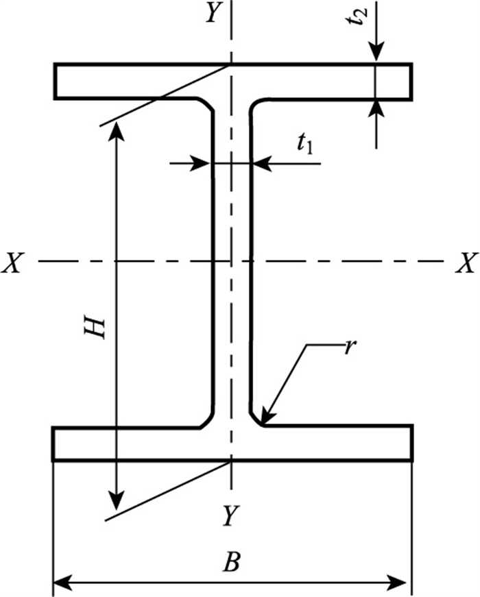 | 图 1 工字形截面参数 Fig. 1 Parameters of Ⅰ-shaped section 注:H为高度;B为宽度;t1为腹板厚度;t2为翼缘厚度;r为圆角半径;X-X为重心横向轴线;Y-Y为重心纵向轴线。 |