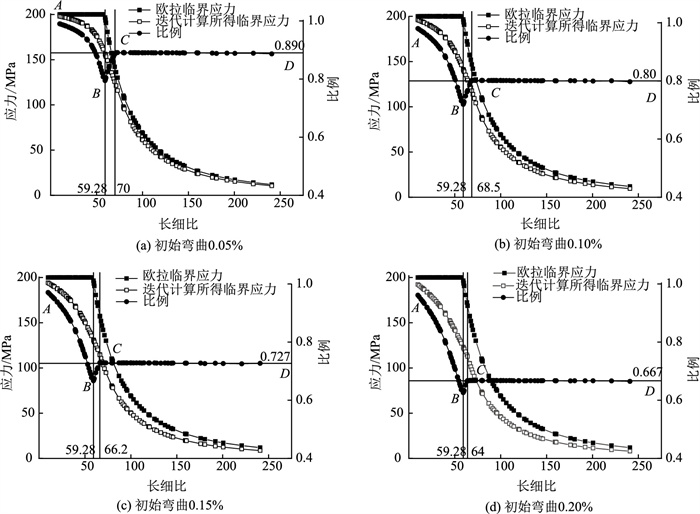C点处杆件所对应长细比值即应力控制与挠度控制的分界点。CD段曲线中,迭代计算所得的临界应力曲线凹凸性发生了改变,下降的速率不再增加,而是在不断减小。CD段中2个应力的比值基本为一定值,并不会随着长细比的增加而明显改变。所以在这一阶段中迭代临界应力可以由欧拉临界应力公式计算值乘以一比例常数求得,如图 5所示。在杆件初始弯曲为0.05%,0.10%,0.15%,0.20%的情况下,这一比例常数分别为0.890,0.80,0.727,0.667。