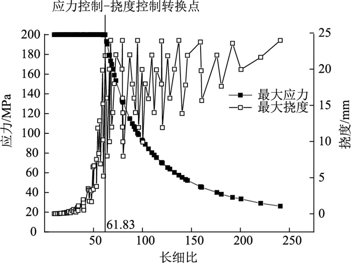 在长细比较小的阶段(长细比小于70),杆件首先在受压一侧的最大压应力达到了200 MPa,此时挠度偏小且挠度会随着长细比的增加而快速增加。此阶段的杆件稳定承载力的控制性因素为压杆的最大应力。对于长细比相差不大的杆件,长度较长的杆件在应力达到200 MPa限制值的情况下挠度偏大。