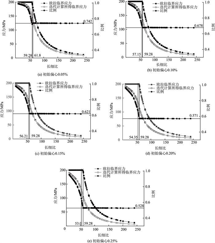杆件初始偏心情况下的图形基本与杆件初始弯曲情况下的图形(见图 4)规律相同。在长细比较小的阶段,杆件稳定承载力的控制因素为最大应力;在长细比较大的阶段,杆件稳定承载力的控制因素转变为杆件的侧向挠度。杆件初始偏心越大,应力控制与挠度控制的转换点所对应的长细比越小。杆件在0.05%,0.10%,0.15%,0.20%,0.25%共5种初始偏心情况下转换点对应的长细比分别为61.83,57.15,56.21,54.35,53.0。除了杆件初始偏心为0.05%时转换点对应长细比大于欧拉临界应力开始下降点对应的长细比59.28外,其余均低于59.28。为了设计阶段的应力选取,将杆件的迭代临界应力、欧拉临界应力、迭代临界应力÷欧拉临界应力所得的比例绘制到一幅图中,如图 7所示。