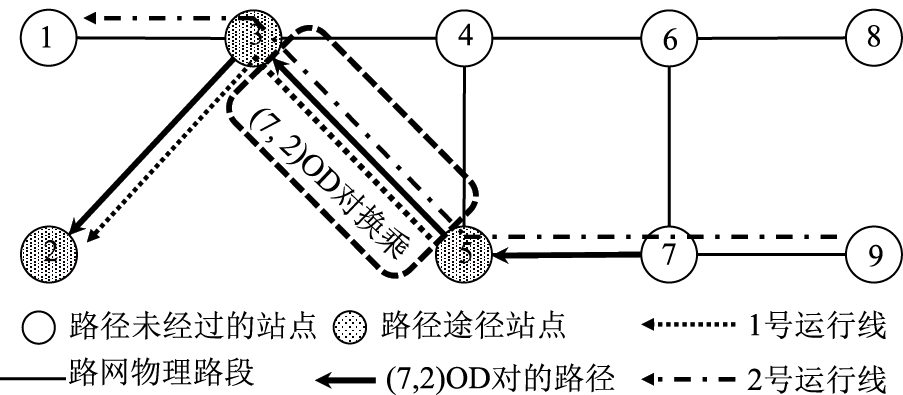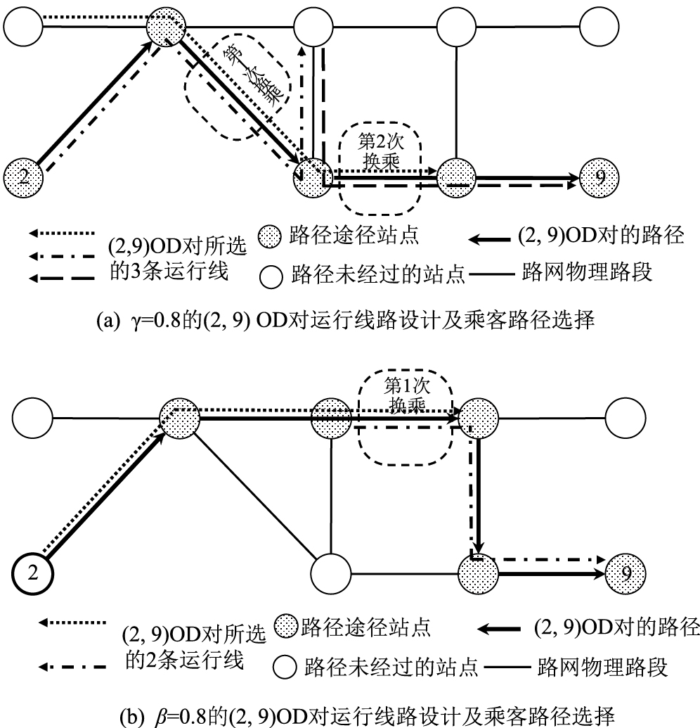 对比2组路径分配结果发现,更注重路径长度时,(2,9)OD对选择最短路径,通过2次换乘完成运输任务;更注重换乘次数时,(2,9)OD对选择较长路径,较前者减少一次换乘即完成运输任务,如图 3所示。路径分配结果共同展现了广义旅行成本2个因素的重要性倾向如何影响运行线路设计和乘客路径分配结果,验证了模型可行性。