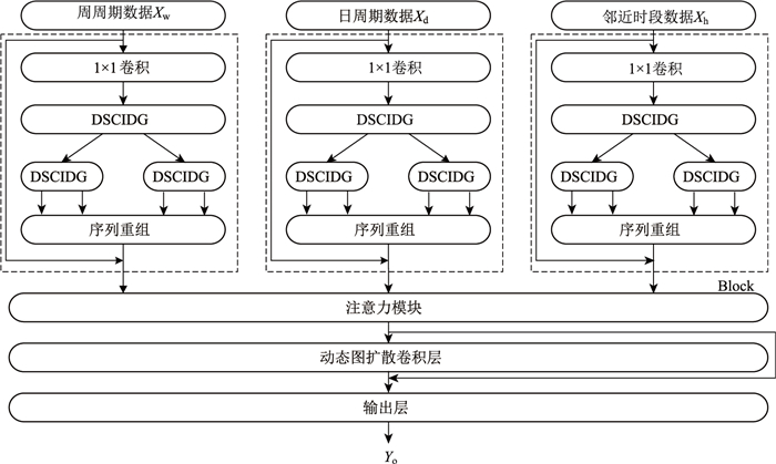 MDDGCNN模型的总体框架如图 1所示,通过树形结构的下采样卷积交互动态图模块(DSCIDG)同步捕获交通流数据在周、日和邻近时段这3个时间尺度下的时空相关性,并引入残差连接[18]减少训练中的特征损失。