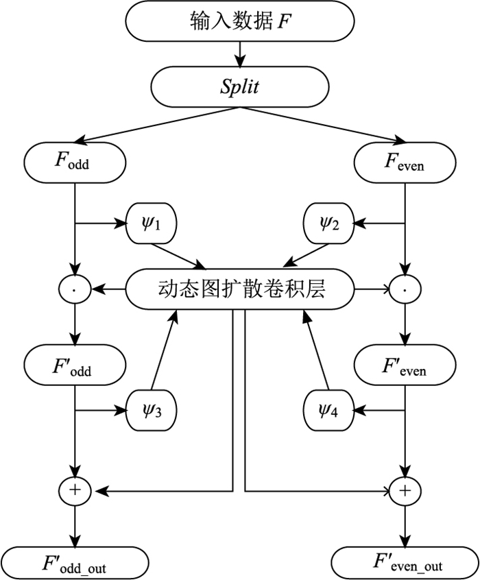 下采样卷积交互结构使得每个DSCIDG模块都具有整个序列的局部和全局信息,具体流程如图 8所示。输入序列F按时间间隔划分下采样为两个长度相等的子序列。随后,两个子序列在交互式学习结构中交互学习,共享学习各自的特征,捕获时间相关性的同时,通过嵌入在交互式学习结构中的扩散图卷积层使两个子序列能够交互学习它们各自的空间相关性。其中独立的卷积模块(ψ1, ψ2, ψ3, ψ4)提取2个子序列中独有的时间特征,将捕获空间特征的动态图扩散卷积模块嵌入其中可以共享模块中的参数权重,为防止下采样过程中的信息缺失通过交互式学习结构聚合这些时空特征,以同步挖掘复杂的时空动态特征。