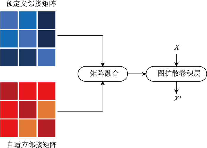 通过节点连接距离关系的预定义邻接矩阵Apre中的各元素如式(10)所示。路网节点的动态空间依赖性难被预定义的固定图结构表示,针对该问题一些工作(Graph WaveNet[10]、AGCRN[11]) 采用自适应邻接矩阵来捕获空间依赖性,如式(11)所示。但这些生成方法与原始路网图结构没有关联,即忽视了预定义图结构。本研究将预定义图结构与自适应图结构相融合,并分配一个可学习的权重参数来捕获动态的空间依赖性,如式(12)所示。图扩散卷积操作定义为式(13)。矩阵融合并进行图扩散卷积的过程如图 9所示,其中
