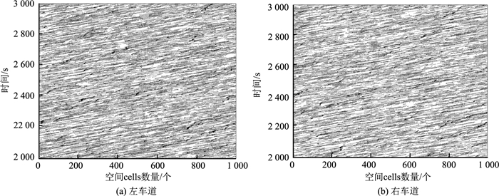 2 数值模拟结果 2.1 时空轨迹图图 1为车流密度ρ=0.1时,新双车道模型的时空轨迹图,黑色点为车辆位置,白色为两车的空间间距(即两黑色点之间的空白元胞数量)。横坐标表示整条车道空间,整条车道为1 000个元胞,对应Lroad=1 000 cells。纵坐标为时间,总时间步为20 000 s,取2 000~3 000 s时间步的车辆空间轨迹为代表。从图 1可以看出,当车流密度ρ=0.1时,黑色点较少,道路系统中车辆数量较少,车辆以高速行驶,道路系统处于自由流状态。