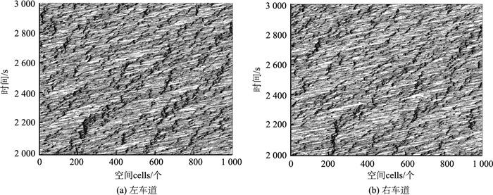 图 3为车流密度ρ=0.4时,新双车道模型的时空轨迹图,取2 000~3 000 s时间步的车辆空间轨迹图为代表。从图 3可以看出,部分黑色点连接成团,表示出现排队现象。此时,道路系统中车辆较多,处于拥挤流状态。
