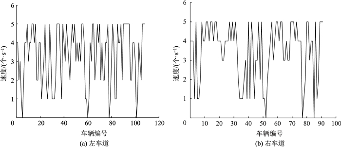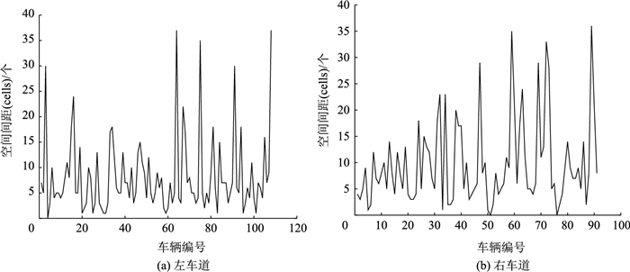 2.2 速度和空间间距对应图 2自由流到拥挤流的中间状态,当道路系统车流密度ρ=0.2时,选取第3 000时间步,观察道路系统中的速度分布和空间间距分布。从图 4(a)中可以看出,第3 000时间步左侧车道有4辆车速度为0。从图 5(a)中可以看出,在第3 000时间步,左侧车道车辆之间的空间间距为0出现1例。从图 4(b)中可以看出,在第3 000时间步,右侧车道有3辆车速度为0。从图 5(b)中可以看出,在第3 000时间步,右侧车道车辆之间的空间间距为0出现2例。从第3 000时间步道路系统中的速度分布和空间间距分布看出,左侧和右侧车道没有出现成规模的堵塞集团。