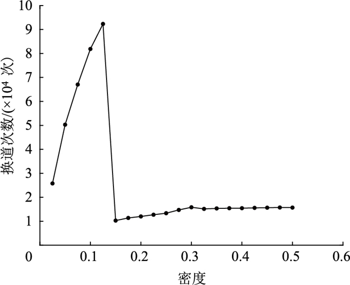 2.4 换道次数变化和交通相变换道次数变化伴随交通状态的改变,换道次数变化与交通相变密切相关。图 8是道路系统中车辆换道次数与密度的关系图,从图 8可以看出,随着道路系统中车流密度增加至临界值,道路系统中车辆的换道次数发生骤减。参见文献[19]提供的换道次数与密度关系曲线,三相交通流理论支持者提供的数据表示,随着道路系统中车流密度增加,道路系统中车辆的换道次数会骤减,呈现“Z”形结构。基本图理论支持者提供的数据表示,随着道路系统中车流密度增加至峰值,再缓慢下降。本研究新双车道模型模拟出的车辆换道次数与密度的关系曲线,以峰值为界,峰值之前,与基本图理论数据一致;峰值之后,与三相交通流理论数据一致。