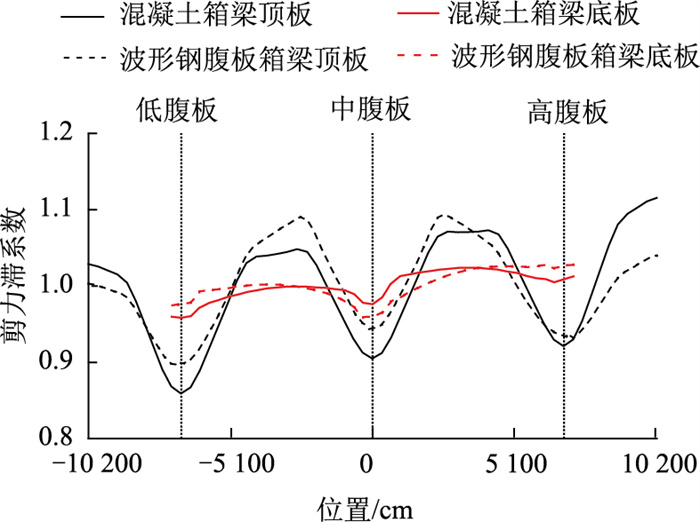 2种箱梁的剪力滞效应状况如图 10所示。由图可见,2种不同的箱梁,其跨中顶板及底板均呈现负剪力滞效应。顶板剪力滞效应较底板更为显著。对于顶板而言,混凝土箱梁剪力滞效应大于波形钢腹板箱梁,最显著处位于低腹板,剪力滞系数分别为0.858和0.896;对于底板而言,在低腹板及高腹板处混凝土箱梁剪力滞效应大于波形钢腹板箱梁,在中腹板处则相反,最显著处位于中腹板,剪力滞系数分别为0.95和0.97。