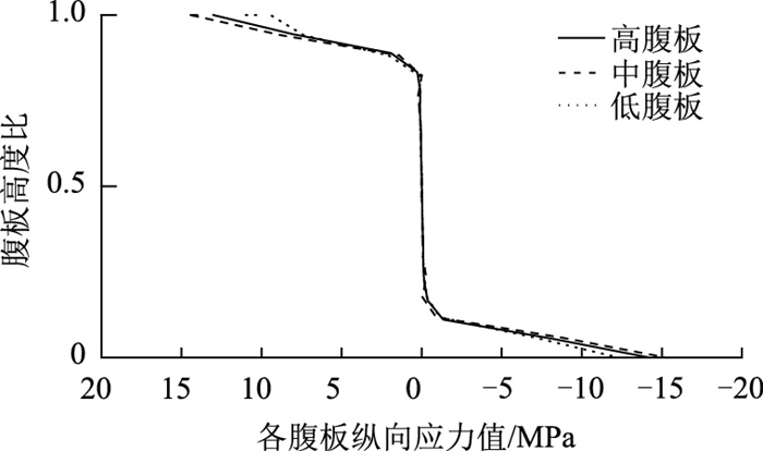 | 图 11 纵向应力沿波形钢腹板高度分布情况 Fig. 11 Longitudinal stress distribution along corrugated steel web height |