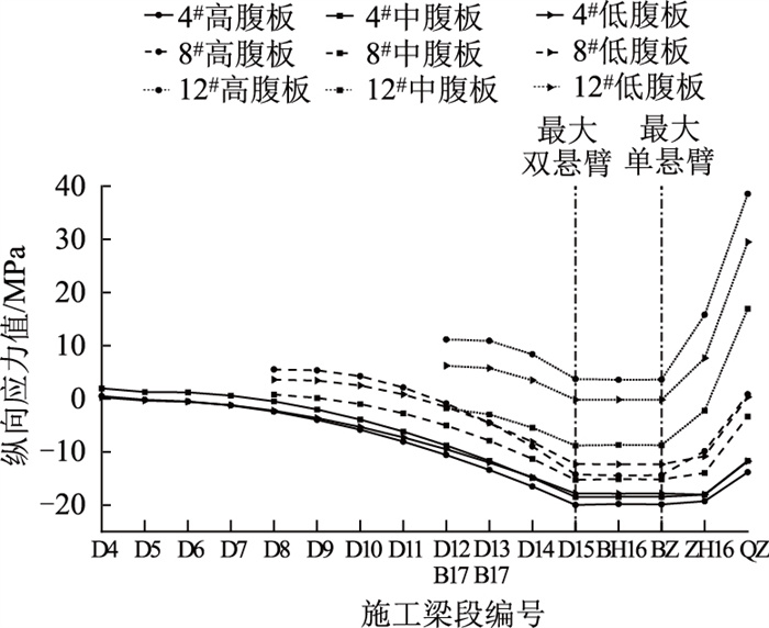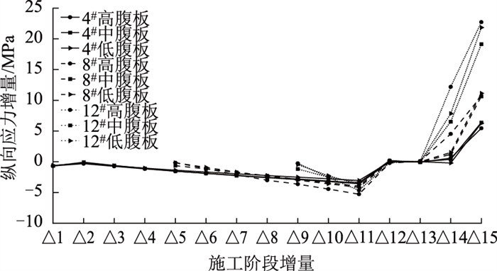 由图 14可见,从双悬臂阶段过渡到单悬臂阶段再到中跨合龙及体系转换的动态施工过程中,在各腹板纵向应力负值增大阶段及纵向应力正值增大阶段,4#大致表现出:中腹板增量最大,其次是高腹板,最后是低腹板。这是由于钢-混结合段内中腹板处混凝土面积较其他2个腹板更大,越靠近钢-混结合段的节段,其中腹板纵向应力增量越大,因此4#的中腹板增量均大于高腹板和低腹板。而越远离钢-混结合段,如靠近跨中的8#~12#,更加清晰地呈现出纵向应力增量随施工发展的分配规律,即高腹板增量最大,其次是低腹板,最后是中腹板。