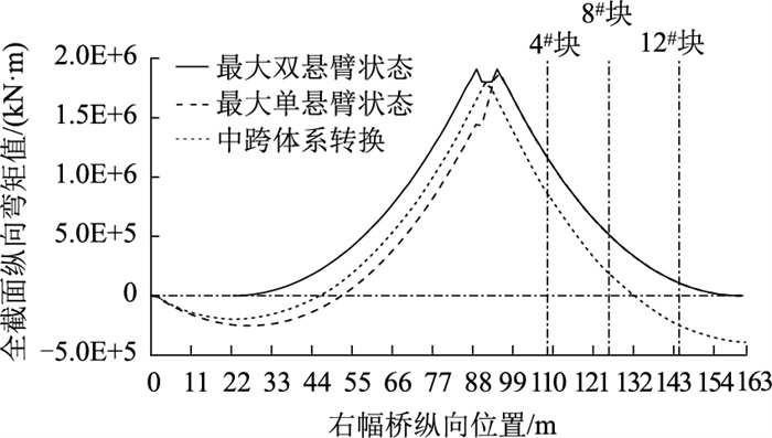 | 图 13 典型施工状态下纵向弯矩分布 Fig. 13 Longitudinal bending moment distribution in typical construction states |