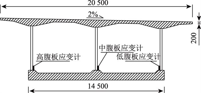 3.1 试验工况采用JMZX-212HAT表面型智能弦式应变计及JMZX-3001综合测试仪对右幅4#的3个腹板下缘位置进行纵向应变的测量,最后通过计算得到纵向应力值,测点位置如图 15所示。
