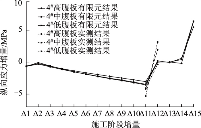 由图 16可见,在实际桥梁的施工建造过程中受许多外在因素如温度、桥上人员机械活载等影响,实桥测试结果与有限元分析结果有不同程度的差异。但观察其变化规律不难发现,不论是实桥试验结果还是有限元分析结果,都得到了较为一致的结论:由于右幅4#受到钢-混结合段、腹板高度及位置等因素的影响,在全桥施工的动态过程中,各波形钢腹板纵向正应力及负应力的增量呈现出中腹板最大,其次是高腹板,最后是低腹板的分配规律。