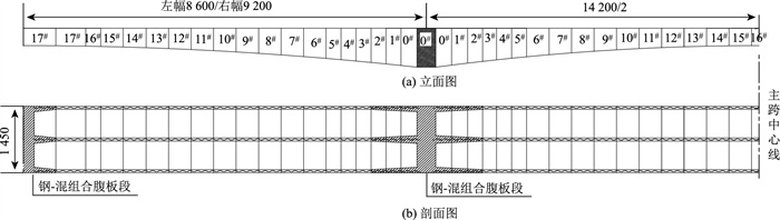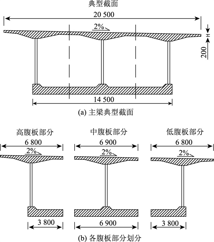 此桥左右两幅对称采用2%的横坡,用于桥面排水,通过调整腹板高度进行实现。因此在设计与计算中应考虑腹板高度的不同,以及腹板自身位置和钢-混结合段的影响。因此需要更为深入地研究腹板差异性对其受力分配的影响以提高结构的安全性和可靠性。