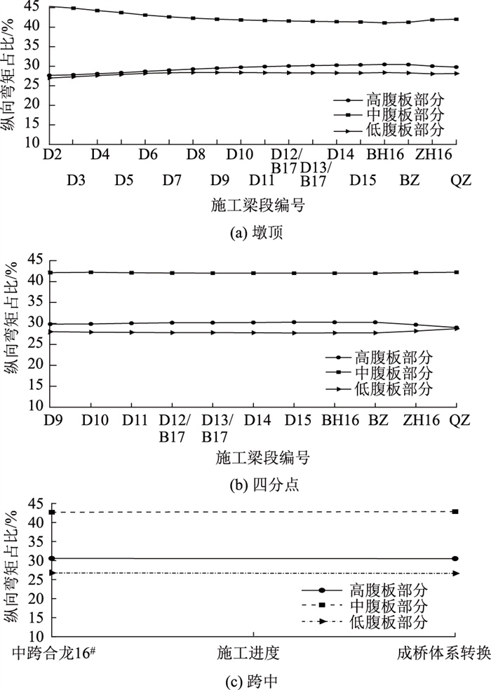 | 图 6 典型截面纵向弯矩分配变化 Fig. 6 Variation of longitudinal bending moment distribution for typical sections |
