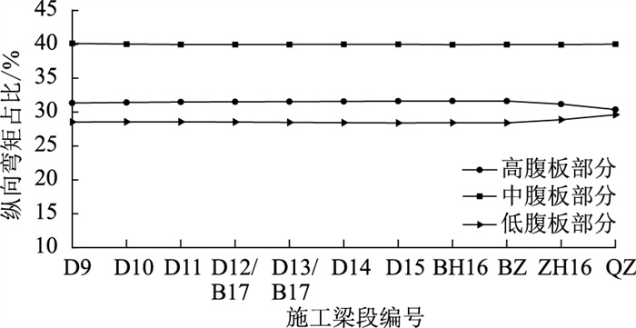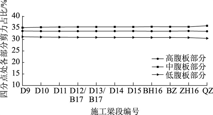 在同类断面混凝土箱梁中,各腹板剪力分配情况如图 9所示。混凝土箱梁中各腹板剪力分配亦表现出中间腹板占比最大,其次是高腹板部分,低腹板部分占比最小的规律,但各部分差异较小。通过与图 8对比,可以明显发现波形钢腹板箱梁中各腹板剪力差异更为显著,并且波形钢腹板占比情况与施工过程相关性更高,表现出明显的变化趋势:刚建成的腹板,其剪力占比情况随后续施工进程逐渐趋于稳定,而混凝土箱梁的腹板剪力分配随施工进度的变化趋势并不明显。这是由于在波形钢腹板箱梁中腹板主要用于抗剪,剪力分配敏感度更高,受波形钢腹板差异性影响更为显著,且更易受到施工进度的影响。