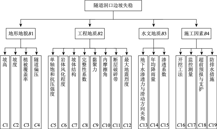对照图 1,参照文献[21]中认可程度分级值,选择敏感性分布值大于等于3的因素作为评价指标,形成了以洞口边坡失稳为评价总目标,以地形地貌、地质条件、气候水文和施工因素为一级指标,以坡高、坡度等19项因素为二级指标的洞口边坡失稳风险递阶评价指标体系,见图 2。
