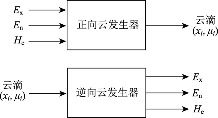 云模型以云发生器生成云图的形式通过指标的数值特征完成定性向定量的转变。云模型的定义为设一定量论域X={xi},D为X上的定性概念。对于X中的任意元素xi,均存在一个趋于稳定的随机数μi∈ [0, 1]称为xi对D的隶属度。若存在xi∈D,则xi在X中的分布即为云模型,(xi,μi)为组成云模型的云滴坐标。