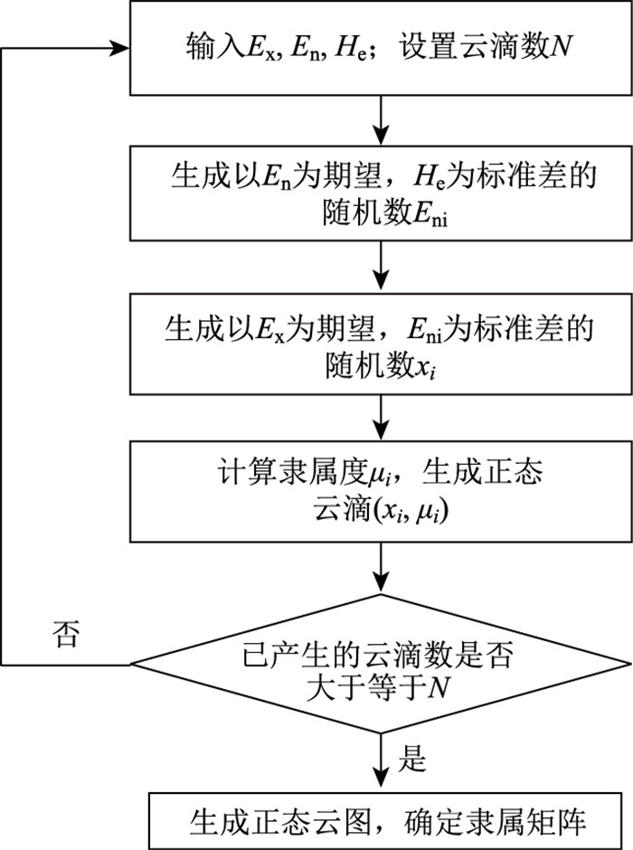 2.2.2 标准云图构建及隶属矩阵确定Ex,En及He这3项标云数值特征值确定后即可通过云发生器生成标准云图。云发生器分为正向和逆向两种。正向云发生器是从定性到定量的映射,根据输入的3个数字特征Ex,En,He及N,即可输出云滴在论域中的坐标生成云图。逆向云发生器是从定量到定性的映射,其构建步骤为正向云的逆过程,见图 4。