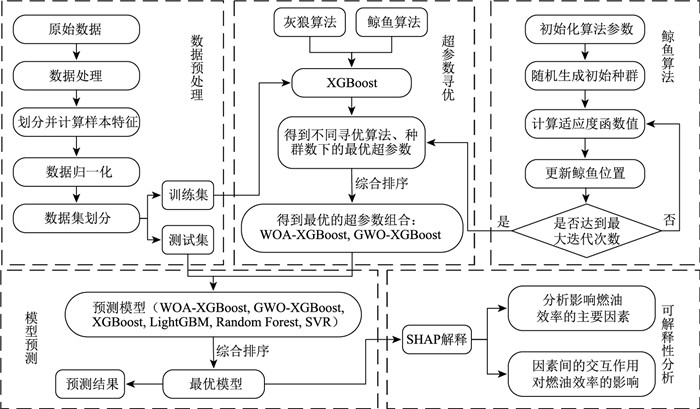 综上,现有研究在车辆油耗影响因素与预测方面已建立了较为完善的理论方法体系,但研究多关注车辆的燃油消耗而非燃油效率。燃油消耗指的是车辆在一定距离或时间内的燃油使用量,而燃油效率则反映了车辆的能源利用水平,通常以单位燃油的行驶距离表示,燃油效率更直观地反映了车辆的能源利用效率。同时,对油耗影响因素的分析大多是独立分析,没有考虑因素间交互作用对油耗的影响。因此,本研究将基于WOA-XGBoost机器学习模型预测货车的燃油效率, 同时,采用SHAP归因分析方法解释WOA-XGBoost模型,以确定货车燃油效率的主要影响因素,并进一步探究这些因素之间的交互作用对货车燃油效率的影响。