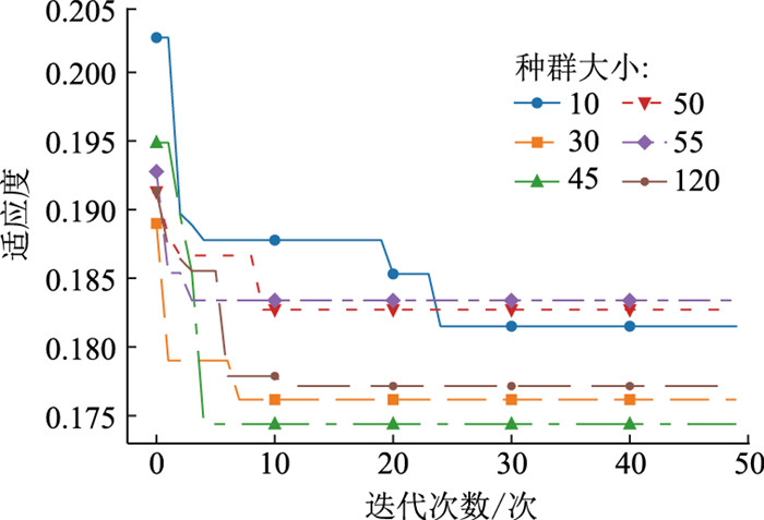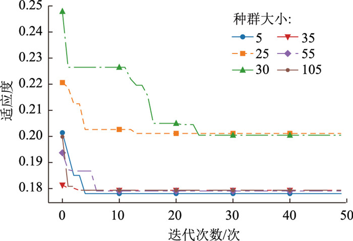 | 图 2 WOA-XGBoost模型在不同种群中的适应度变化曲线 Fig. 2 Fitness variation curves of WOA-XGBoost model in different populations |