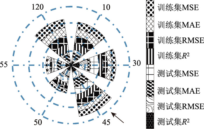 在不同种群值下,WOA-XGBoost模型在50次迭代后均达到了稳定状态,其适应值变化如图 2所示。不同种群下模型的最优超参数和结果如表 3所示。由于不同种群值下模型的评价指标各有差异,难以确定最佳超参数,因此需要综合评价不同种群值下的模型性能。综合评价结果如图 3,其中箭头指向表现最优的模型,WOA-XGBoost模型的最优种群为5或55。当种群数量为5时,模型在测试集上的MSE值为0.251 2,MAE值为0.145 7,RMSE值为0.501 2,R2为0.968 0,模型的最佳参数组合为(最大深度为6,学习率为0.196 9,树的数量为131)。