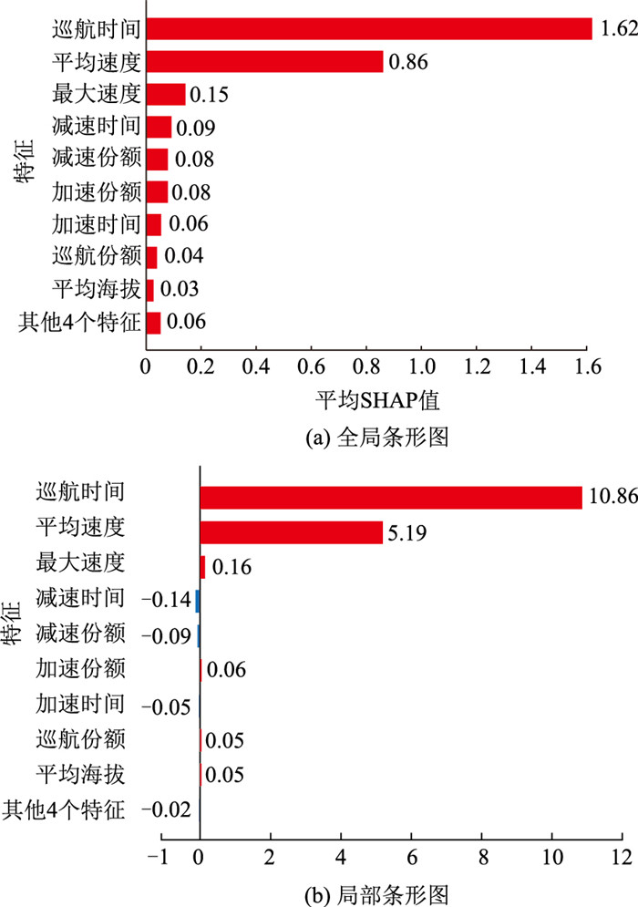 (2) 使用全局条形图和SHAP摘要图分析了XGBoost模型中各特征对模型输出的影响及SHAP值分布,其中巡航时间对模型输出的影响最大,其次是平均速度和最大速度等特征,巡航时间、平均速度和最大速度的平均SHAP值分别为1.62,0.86,0.15。