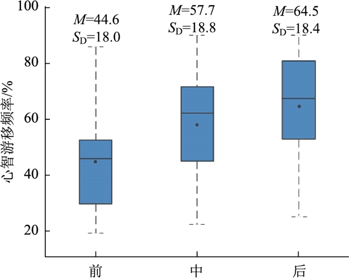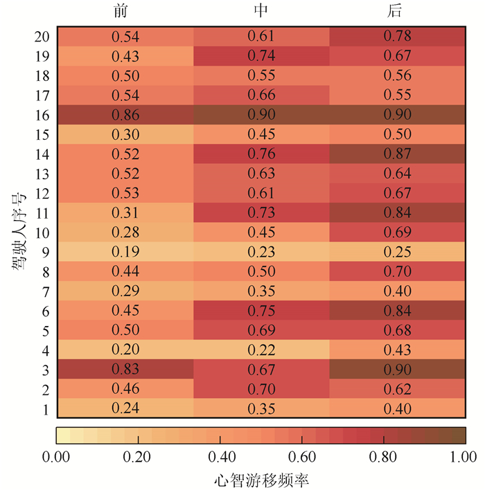 2.2 驾驶时长对心智游移频率的影响人机共驾条件下驾驶人执行单调、简单的监控任务,随着时间延长其可能更难将注意力集中在监控任务上,更易陷入心智游移状态[20]。为探究驾驶时长对驾驶人心智游移发生频率的影响,将试验过程划分为前、中、后3个阶段,每个阶段持续20 min,分别计算不同阶段20名被试者的心智游移发生频率,其热点图分布如图 3所示。显然,20名被试者处于最后阶段时的心智游移发生频率均高于最初阶段的。图 4显示,被试者驾驶时间越长,其心智游移发生频率的均值越大(前:M=44.6%,SD=18.0%;中:M=57.7%,SD=18.6%;后:M=64.5%,SD=18.4%)。