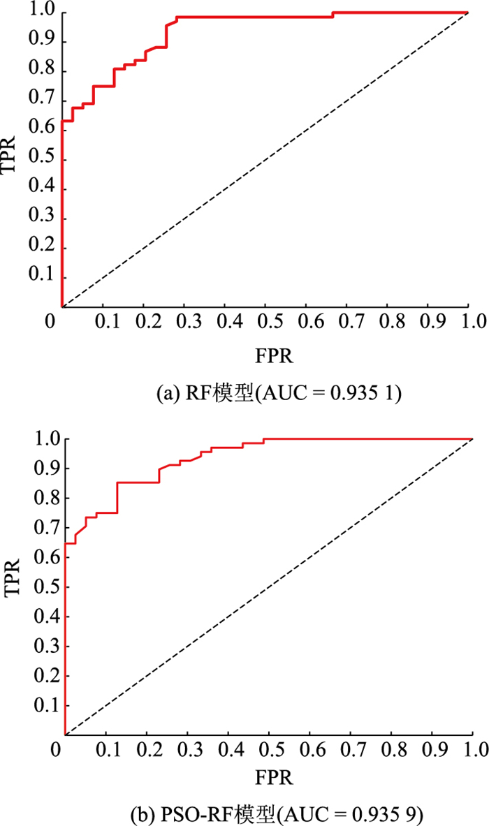 被试者工作特征曲线(Receiver Operating Characteristic,ROC)下方的区域面积为AUC (Area under the Curve)值(图 9),其范围在0~1之间,AUC值越大,表示模型预测效果越好[26]。计算得到RF模型的AUC值为0.935 1,PSO-RF模型的AUC值为0.935 9,均大于0.8,说明两个模型在驾驶人心智游移预测方面均表现出良好的性能[27],故综合混淆矩阵评价指标可知PSO-RF模型对于驾驶人心智游移的预测效果更佳。
