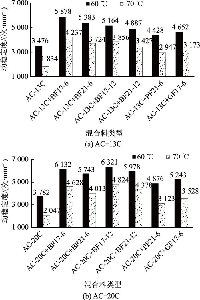 由图 1可知,随着试验温度的增加,相同级配类型、相同纤维类型混合料的动稳定度试验结果降幅显著,当试验温度为70 ℃时,未掺纤维的AC-13C和AC-20C混合料的动稳定度分别为1 834、2 047次· mm―1,已不满足《公路沥青路面施工技术规范》(JTG F40—2004) 中改性沥青混合料动稳定度不低于2 800次· mm―1的技术要求;相同级配类型、相同试验温度时,掺玄武岩纤维混合料的动稳定度试验结果显著高于聚酯纤维和玻璃纤维;相同试验温度下,掺BF17-6的AC-13C混合料及掺BF17-12 AC-20C混合料动稳定度试验结果均最优,表明单丝直径为17 μm的玄武岩纤维对混合料高温性能的改善效果优于单丝直径为21 μm的玄武岩纤维,玄武岩纤维长度的选择受混合料公称最大粒径影响。究其原因,SBS I-D聚合物改性沥青的软化点一般小于70 ℃,试验温度为70 ℃时,已超出沥青的软化点温度,未掺纤维混合料的动稳定度试验结果会显著降低;纤维与热骨料拌和过程中能够以单丝直径状态均匀三维乱相分散在混合料当中,具有吸附、稳定沥青的效果,吸附沥青的纤维能够在矿料之间起到桥接的作用,增强混合料的整体稳定性能,从而改善沥青路面高温抗塑性变形能力;玄武岩纤维属于矿物纤维,其本质是玄武岩物理形态的变化,且力学性能优异,与混合料的相容性优于其他纤维,因此混合料的高温性能优于其他纤维;相同纤维掺量下,单丝直径更细的玄武岩纤维吸附、稳定沥青的效果更好,公称粒径更大的混合料需要更长纤维才能起到更强的桥接作用。