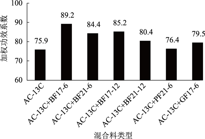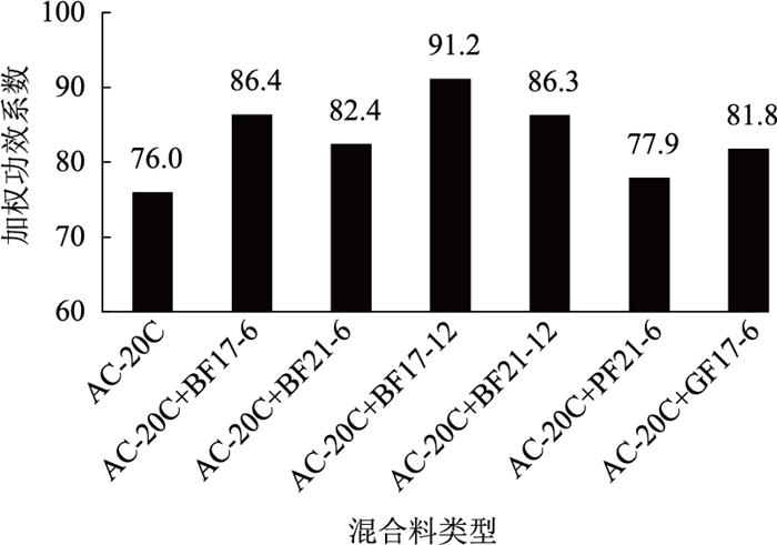 由图 10和图 11可知,相同级配类型条件下,掺BF17-6 AC-13C混合料及掺BF17-12 AC-20C混合料整体功效系数最优,表明这2种混合料从路用性能及经济性方面考虑具有较高的性价比,可大规模应用于沥青路面工程实体当中。