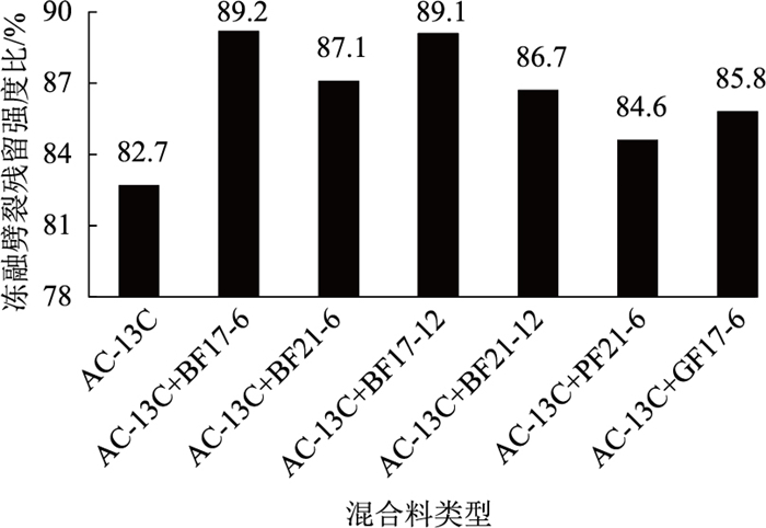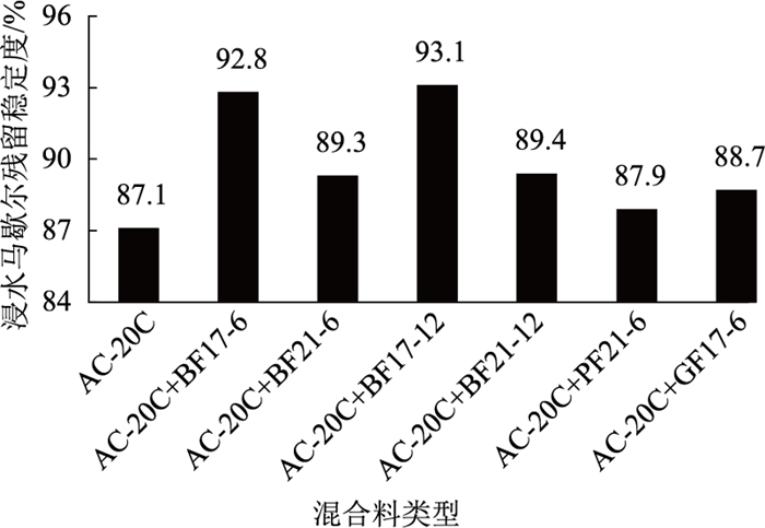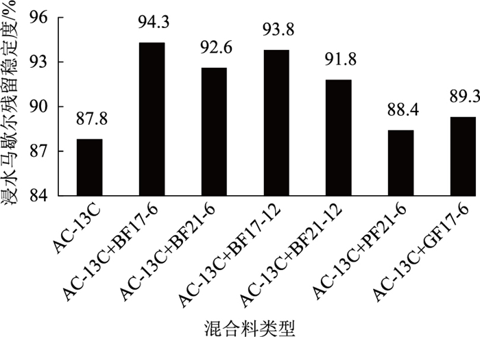 2.3 水稳定性水损害是多雨地区沥青路面最常见的病害形式。沥青路面在通车运营过程中会受到雨水冲刷、路面积水浸泡、结构层内部残留水冻融循环、车辆轴载及紫外线照射等综合外界因素的长期作用,沥青逐渐老化,沥青与矿料之间的黏结能力逐渐降低,沥青胶浆极易从矿料之间剥落而出现松散、坑槽等路面病害[19-22]。本研究参照JTG E20—2011的规定成型马歇尔试件,选用浸水马歇尔及冻融劈裂试验来评价不同纤维、不同级配类型沥青混合料的抗水损害能力,试验结果分别见图 6~9。