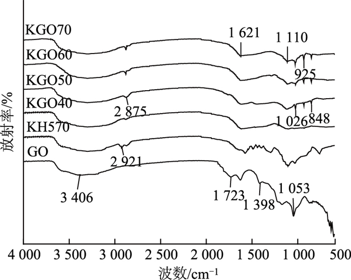 2 结果与讨论 2.1 GO和KGO的表征FTIR光谱分析能获取样品中各种化学官能团的信息[17],各个样品的FTIR光谱图见图 1。在GO的FTIR图谱上,在3 406 cm―1处可观察到一个由—OH官能团伸缩振动引起的宽峰;1 723 cm―1和1 621 cm―1处的峰分别对应C=O官能团的伸缩振动和C=C官能团的弯曲振动;在1 053 cm―1和1 398 cm―1处还分别出现了C-OH官能团的弯曲振动吸收峰和C—O—C官能团的伸缩振动特征峰。由此可见,GO原料含有大量的含氧亲水基团。与GO相比,KGO的FTIR图谱明显不同。首先,除KGO40外,所有KGO均在1 026 cm―1处有Si—O—Si官能团的伸缩振动峰,这是由硅烷基水解缩合形成的;在925 cm―1和1 110 cm―1处出现的新吸收峰,分别对应于Si—O和Si—O—C两个官能团;2 875 cm―1处的峰对应于—CH3在KH570上的伸缩振动,而848 cm―1处的峰对应于由KH570水解产生的硅醇与GO上的活性物质反应生成的乙二醇结构基团(—CH2CH2O—)。此外,GO的FTIR图谱中C=C和OH的特征吸收峰仍在KGO中观察到,但KGO的羟基峰有向3 400 cm―1方向偏移的趋势,这可能是由改性后存在的游离Si—OH造成的。总之,FTIR图谱的变化表明KH570已成功嫁接到了GO上。这种改性方法保留了GO层上的—COOH基团,同时消耗了GO表面的—OH和环氧基等官能团,使GO在静电斥力作用下均匀分散在水泥浆体中。通过对比KGO40,KGO50,KGO60和KGO70这4组KGO的FTIR图谱,可知KGO50的改性效果最好,而KGO40的改性效果最差,这是由于40 ℃的反应温度较低,不能为反应提供足够的能量,导致KH570水解产生的硅醇不能与GO表面的羟基发生很好的反应,难以达到改性的效果。