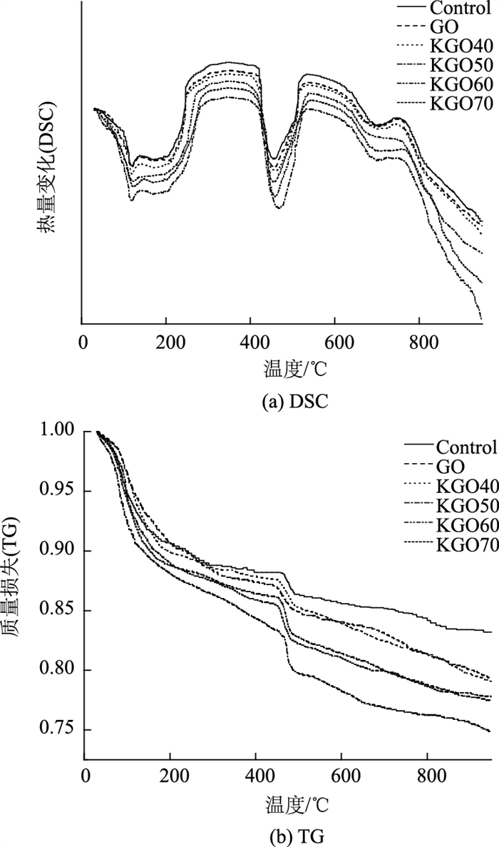 TG/DSC曲线可研究水泥中的化学反应和热性质[21]。图 5为水泥样28 d的TG/DSC曲线。通常,DSC曲线显示了水泥C-S-H凝胶和钙矾石(80~140 ℃)脱水或分解、Ca (OH)2(400~520 ℃)分解和CaCO3(660~750 ℃)分解的3个吸收峰[22]。由图 5可知,空白样整体失重16.91%,有3个明显的失重峰;其中,105 ℃以下的失重是由于脱除了非蒸发水,100~200 ℃的持续失重是由于钙矾石和C—S—H凝胶中弱结合水的脱除,400~500 ℃处的失重是由于Ca (OH)2的分解和脱水。同样地,GO和KGO对应的TG曲线也出现了3个失重峰。与对照相比,加入GO后水泥基复合材料的失重明显增加为20.9%。而KGO40的失重率比GO略低为20.7%。KGO50,KGO60和KGO70的总失重分别为20.7%,25.19%,22.58%和22.17%。其中,KGO50在400~ 500 ℃处有最强的Ca (OH)2失重峰。总体而言,加入GO和KGO使水泥基复合材料的失重率比空白水泥样高,表明GO和KGO的加入与空白样相比能够增加Ca (OH)2的含量,证明它们能够促进水泥的水化。此外,KGO的掺入效果优于GO,尤其是KGO50的掺入效果最好。