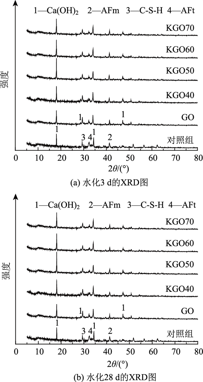 图 6为空白水泥样、GO水泥基复合材料和4种KGO水泥基复合材料水化3 d和28 d后的XRD图谱。可以看出,与对照相比,无论是否添加GO和KGO,衍射峰的位置都没有差异,表明GO和KGO的掺入并未改变水泥水化产物的种类。研究表明,Ca (OH)2是水泥基材料主要水化产物中含量最丰富的结晶物质,对水泥基材料的微观形貌和结构有重要影响[23]。因此,不同KGO对水泥基复合材料微观形貌和结构的影响可通过主要水化产物Ca (OH)2的变化来表达。与对照相比,KGO40位于18.23°处Ca (OH)2的衍射峰没有显著变化,而KGO50,KGO60和KGO70的衍射峰峰强变高,且KGO50的峰强最高。该结果与TG/DSC的结论一致,即KGO显著促进了水泥水化,增加了Ca (OH)2的含量。