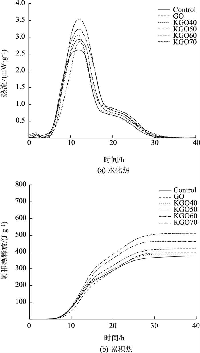 水化热是评估水泥水化反应强度、速率和品质的重要指标之一[20]。图 7为本研究中样品3 d的水化热曲线。水化放热速率曲线在水泥与水接触后的几分钟内出现放热峰,该峰由水泥颗粒的快速溶解引起;随后,由于水泥颗粒溶解速率降低和溶液的过饱和,放热速率迅速下降。与对照相比,GO和KGO在水化初期的初始热流都显著增加。这一现象可以用成核效应来解释,即当GO或KGO与水泥混合时,GO或KGO的高比表面积和活性官能团可以降低成核势垒,为水化产物提供成核位点,从而加速水泥水化,由于这是一种涉及官能氧化基团和溶解离子的放热反应,既促进了晶体的形成,又增加了热流。当水泥水化进入加速期时,水化产物迅速形核长大,此时,与对照组相比,GO和KGO水泥样的水化放热峰更高。这种现象的出现是由于GO和KGO可充当水化成核位点,促进了水化产物的成核和生长。但是,GO水泥样的水化热峰低于KGO组,这是由于分散性对纳米材料发挥成核位点的优势至关重要,而GO在水泥中的分散性受阻,难以发挥成核效果。由图 7可知,掺杂KGO50的水泥水化放热峰不仅出现最早而且强度最高,表明KGO50在水泥中的分散最为均匀。累积放热曲线结果显示,KGO水泥样的累积水化热明显更高,进一步证实KGO的加入促进了水泥的水化过程,改善了水泥复合材料的性能。