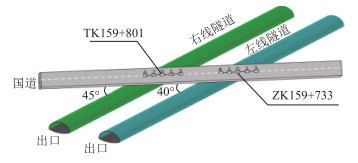 2 工程验证 2.1 工程概况依托工程为宝鸡—汉中高速关林子隧道出口段工程。该隧道围岩为强风化片麻岩,节理裂隙发育,岩体破碎。关林子隧道下穿隧道出口位于G316国道下方,隧道左线ZK159+733与右线YK159+801断面均处于最小埋深。当修建隧道下穿于既有道路时,爆破振动对既有道路会产生影响,尤其当下穿隧道开挖断面大、埋深小时,爆破振动产生的效果更明显。此下穿隧道左线与G361国道呈40°交角,下穿隧道右线与G361国道呈45°交角,两者位置关系如图 1所示。