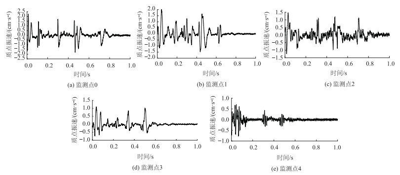 从图 2波形图可以看出,在0~0.2 s时间区段里,Z方向质点振速最大。在后续时间里,质点振速仍出现多次大幅波动,然后慢慢衰减直至消失;YK159+801断面的爆破振动过程中在监测点0处达到最大质点振速为2.35 cm/s,在监测点4处是最小质点振速为0.29 cm/s。从表 3可以得出距离爆源越远其质点振速越小的规律。在监测过程中质点最大振速为2.35 cm/s,满足设计安全振速小于2.5 cm/s要求。